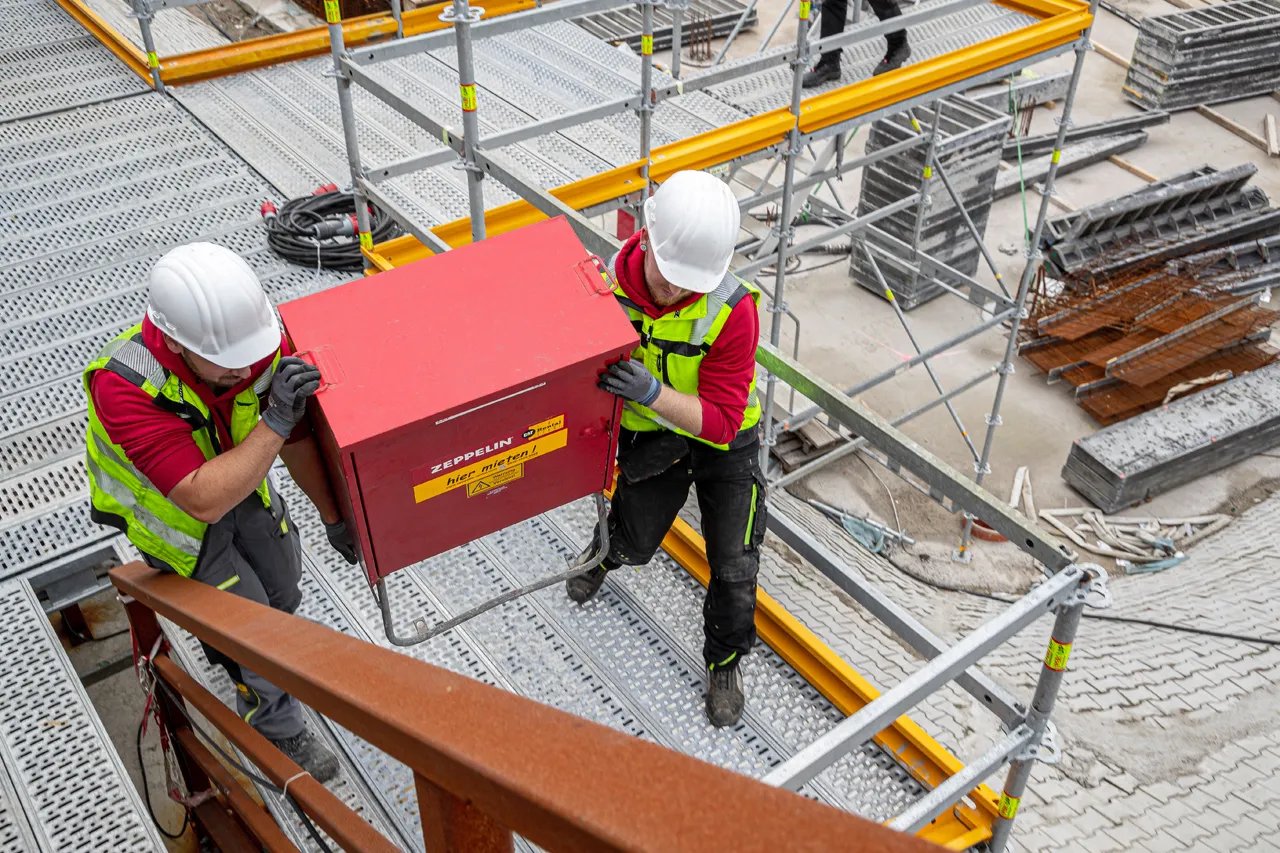 Zeppelin Rental wurde mit der Planung und Umsetzung der Elektro-Baustelleneinrichtung beauftragt. Zum Leistungsspektrum gehörte die Ermittlung des erforderlichen Energiebedarfs sowie die Montage der Gruppen-, End- und Einzelverteiler, die über eine Trafostation versorgt werden. Die Kranverteiler mussten aufgrund der Lage des Bauvorhabens inmitten der Norderelbe in den Krantürmen auf rund zehn Metern Höhe montiert werden. Im Projektverlauf übernimmt Zeppelin Rental zudem die regelmäßige Prüfung und den Umbau der Elektro-Baustelleneinrichtung sowie die Installation einer Bauwegebeleuchtung.