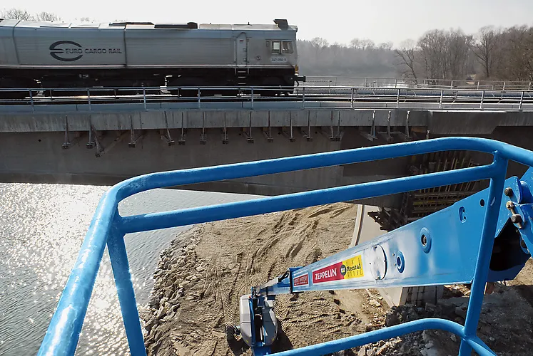 Schließlich rollte nach der Fertigstellung der Oberbauarbeiten am 4. Oktober 2011 der erste Zug über die neue Brücke. Für ALPINE-Polier Christian Walther bedeutete das aber noch nicht das Ende seines Einsatzes am Inn. Momentan wird die Oberfläche der Brücke bearbeitet – bei vollem Schienenverkehr und mit Hilfe von Zeppelin Rental. Für das sogenannte Stocken, das Einebnen der Steinflächen bzw. die Abarbeitung von Unebenheiten, ist die Teleskopbühne ZT34.24D des Komplettanbieters im Einsatz. Durch das Stocken erhält das Brückenbauwerk eine raue und matte Oberfläche, die durch Frost und Abwitterung nicht unansehnlich werden kann.