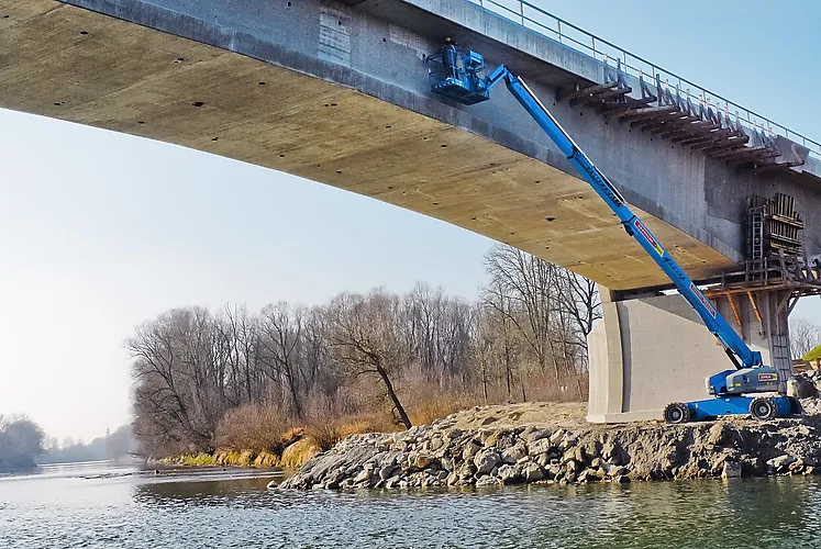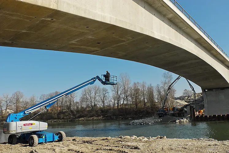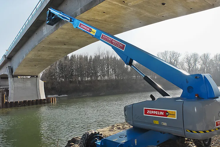 Die eingesetzte Arbeitsbühne von Zeppelin Rental eignet sich mit ihrer Arbeitshöhe von 34 Metern perfekt, um von den Pfeiler-Plattformen aus das Mittelfeld der Brücke über dem Inn zu bearbeiten. Christian Walther: „Mit dem Service von Zeppelin Rental sind wir sehr zufrieden – uns wurde das für unseren Bedarf optimale Gerät zur Verfügung gestellt.“ Dank seines breiten Spektrums an LKW- und Anhängerbühnen, Scheren-, Vertikal sowie Teleskop- und Gelenkteleskopbühnen hat Zeppelin Rental für jedes Projekt die richtige Lösung im Programm.