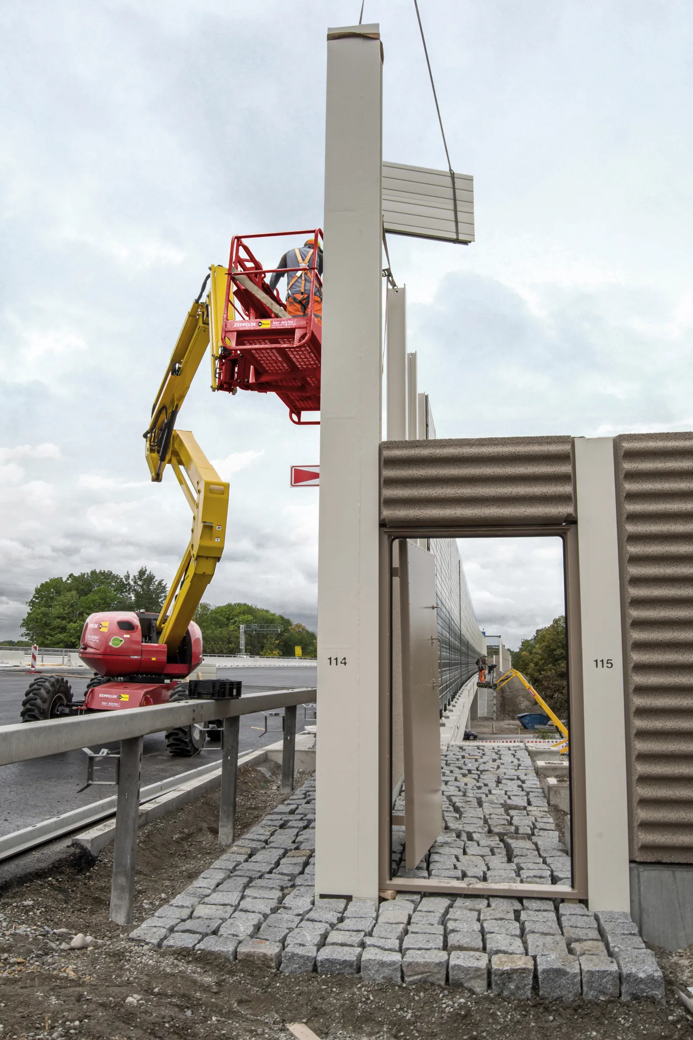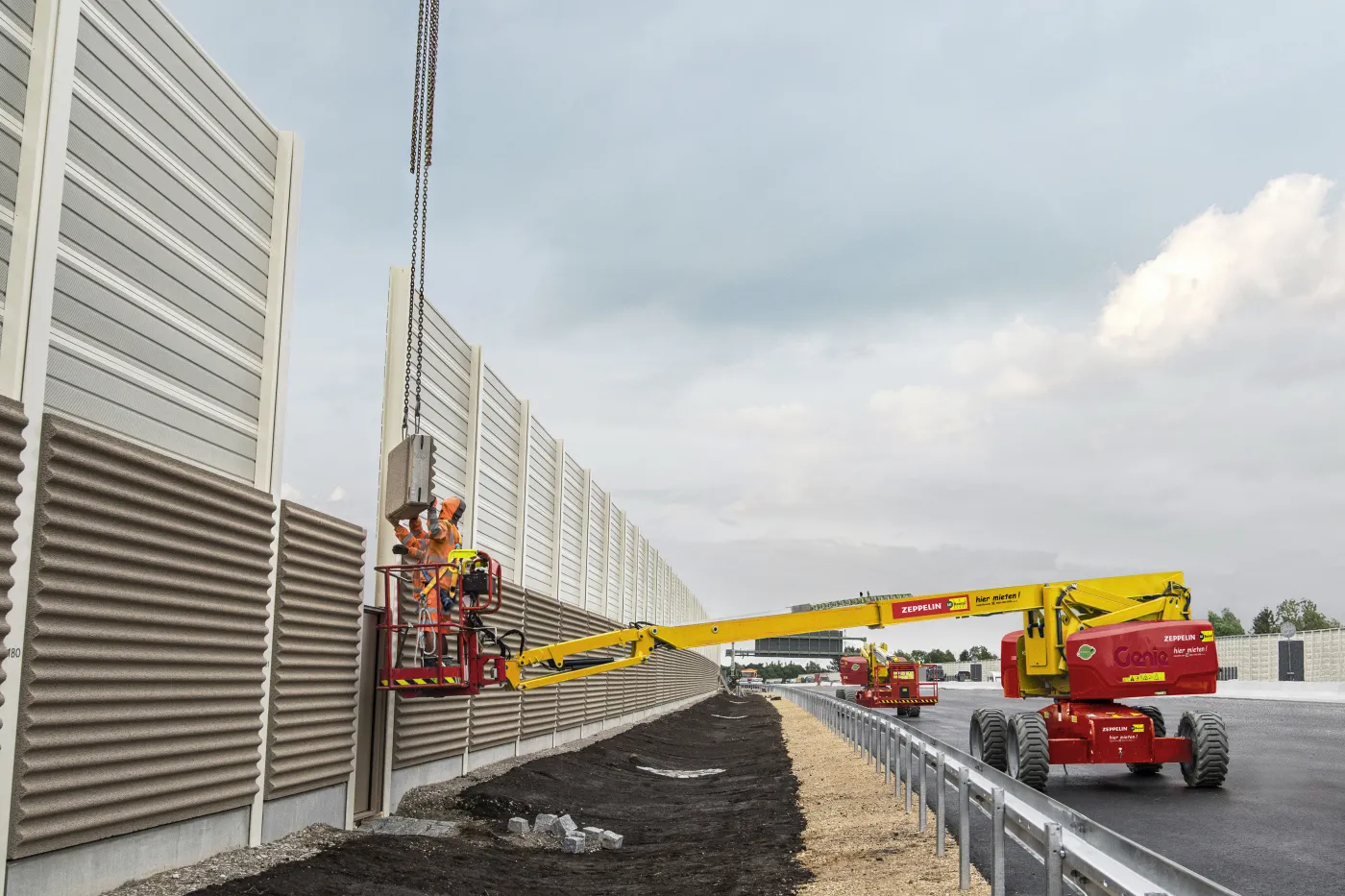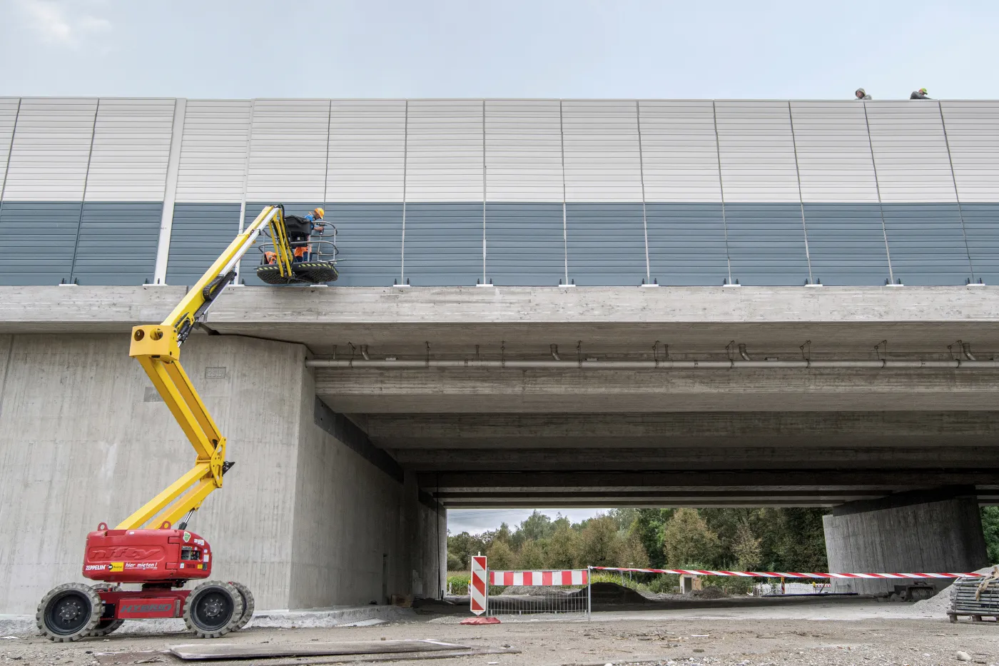 Circa sieben Wochen hat das zehnköpfige Team von Andreas Härtl an der Lärmschutzwand gearbeitet, die sich zwischen der Westseite der S-Bahn-Brücke und der Ostseite der Isarbrücke in einem ansprechenden beige-weiß und dunkelblau aus hochabsorbierenden Porenbeton und Aluminium-Elementen erstreckt. Nachdem das Fundament und die 265 Stützpfeiler entlang der genau 915 Meter langen Lärmschutzwand gesetzt waren, wurden per Autokran die tonnenschweren Betonteile zentimetergenau eingehoben. Dabei waren auch die fünf Gelenk-Teleskopbühnen von Zeppelin Rental rege im Einsatz. Sie ermöglichten den Mitarbeitern von Josef Rädlinger und weiteren Subunternehmern, effizient und simultan nebeneinander an der Lärmschutzwand und an dem sich anschließenden Fledermauszaun zu arbeiten. Mit einer Arbeitshöhe von 20 Metern ist die wendige Gelenk-Teleskopbühne ZGT20.11HY perfekt für die Montage in großen Höhen und Reichweiten geeignet. Vor allem für die Arbeiten auf der Nordseite der Autobahnbrücke über die Münchner Straße Richtung Ismaning war die volle, verfahrbare Ausfahrlänge von Vorteil.