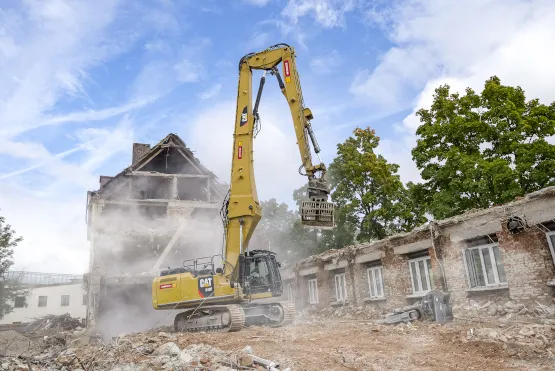 Der Rückbau erfolgte von der Südseite der Kaserne und umfasste drei Stockwerke. Aufgrund der vorgegebenen Position und Höhe benötigte die Firma Umweltmeister einen Abbruchbagger mit genügend Reichweite und Traglast. Das passende Gerät fand Oberbauleiter Andreas Wittenberg im CAT 340F UHD aus der Mietflotte von Zeppelin Rental. Das UHD in der Nomenklatur des Caterpillar-Kettenbaggers steht für „Ultra High Demolition“ und ist speziell für Abbrucharbeiten in größeren Höhen konzipiert. Der 47 Tonnen schwere Longfront-Bagger erreicht eine Einstechhöhe von knapp 22 Metern und kann bei einer horizontalen Reichweite von 13 Metern Lasten von bis zu 3,6 Tonnen bewältigen. Die Decken der einzelnen Geschosse zwickte der CAT 340 UHD stückchenweise mithilfe der Abbruchschere ab, den heruntergefallenen Bauschutt trug er zwischendurch von der nächsttieferen Ebene mithilfe des Sortiergreifers ab.