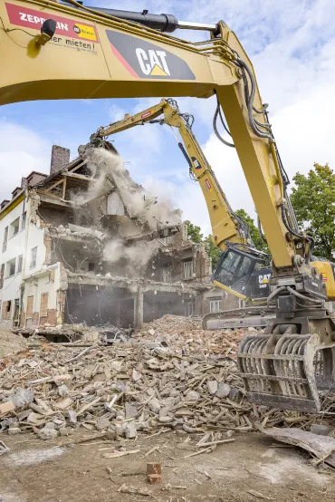 Bei Zeppelin Rental ist das Gerät standardmäßig mit dem vollhydraulischen OilQuick-Schnellwechsler ausgestattet. „Wir haben im Grunde das gesamte Anbaugeräte-Sortiment von Zeppelin Rental hier vor Ort auf der Baustelle. So macht Arbeiten Spaß. Wir können flexibel zwischen Pulverisierer, Abbruchhammer und -Sortiergreifer hin und her tauschen, das erleichtert den Rückbau sehr. Und mit dem Longfront, das macht auch meinen Maschinisten Spaß. Ich bin und bleibe überzeugt von CAT-Maschinen. Die Baumaschinen sind leistungsstark, emissionsarm und sparsam im Verbrauch, das rechnet sich“, so Oberbauleiter Andreas Wittenberg.