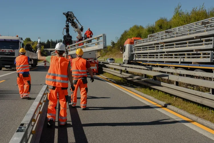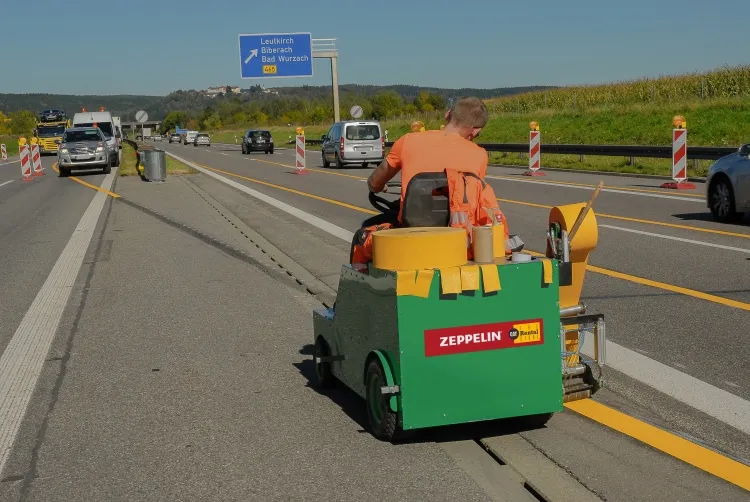 Als Begrenzung der rechten Behelfsfahrbahn in Richtung München sah der Auftraggeber Fahrbahnbegrenzungsknöpfe vor. 2.500 Stück brachten die Verkehrssicherungsmonteure davon auf die Fahrbahn. Außerdem gehörten die Sperrung der Abfahrt Leutkirch und zahlreiche Beschilderungsauskreuzungen sowie die Organisation von 8.000 Metern transportabler Schutzeinrichtung zum Leistungsspektrum von Zeppelin Rental.