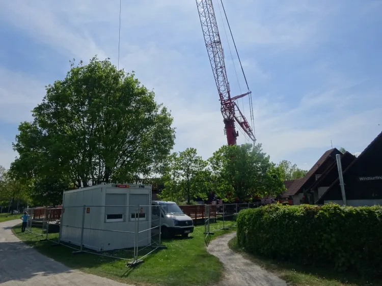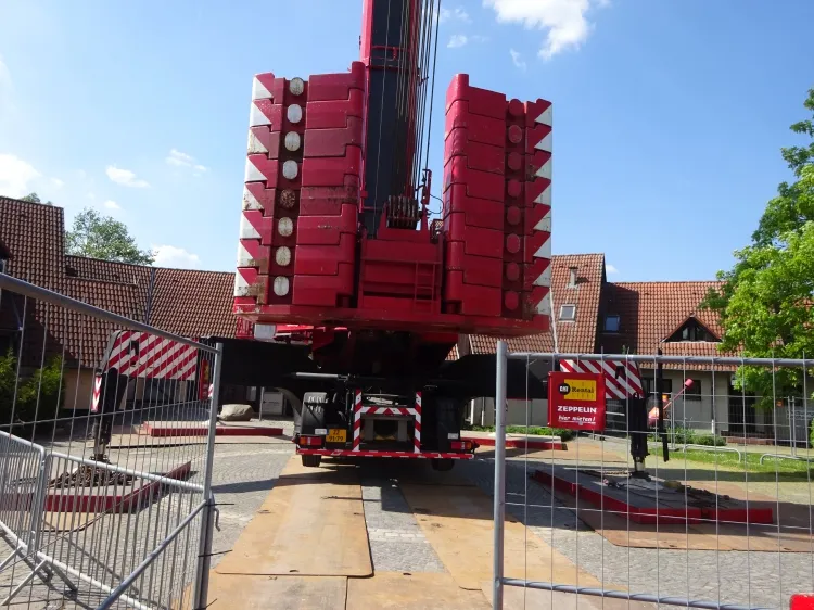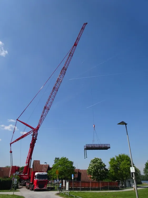 Dabei kam ein Schwerlastkran mit einer maximalen Ausladelänge von rund 100 Metern zum Einsatz. Er wurde angeliefert und von einem kleineren Kran aufgebaut. Anschließend hob er die alten Brückenelemente heraus, bevor es an den Einhub der neuen Teile ging. Insgesamt sieben Brückenelemente mit einem Gewicht von je fünf Tonnen und einer Länge von je elf Metern waren an Ort und Stelle zu transportieren.