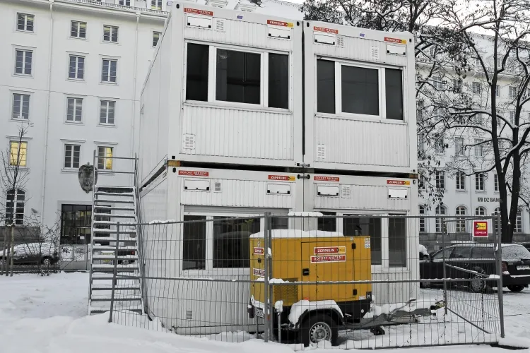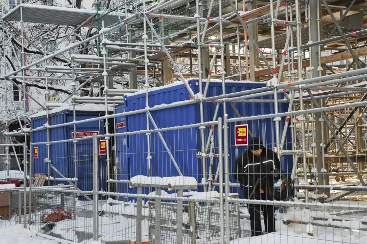 In die Gerüstkonstruktion und damit in die Schaustelle integriert sind auch Raumsysteme von Zeppelin Rental. Drei Materialcontainer dienen als Lagerstätte und der Unterbringung der Technik, zwei Spezialcontainer geben Wachschutz und Catering Raum, außerdem finden sich im Erdgeschoss je ein Damen-, Herren- und Behinderten-WC-Container. Letzteren stattete das Kompetenz-Center Raumsysteme von Zeppelin Rental in Lochhausen vorschriftsgemäß mit einer Rufsignal-Anlage aus. Damit der Sanitärcontainer optimal in die Schaustelle passt, wurden auch die Fenster- und Türenpositionen verändert. Doch dies war nicht der einzige Spezialumbau, den Zeppelin Rental vornahm: Das Abwasser wird mit Hilfe einer Hebeanlage in die Tanks gepumpt, außerdem passen zusätzliche Belüftungen und eine größere Anzahl an Steckdosen die Raummodule nun optimal an die Kundenwünsche und herrschenden örtlichen Gegebenheiten an. Während der Bauzeit nutzten des Weiteren Bauherren und Arbeiter einen Doppel- sowie zwei Einzelcontainer des Vermietunternehmens als Besprechungs- und Aufenthaltsräume.