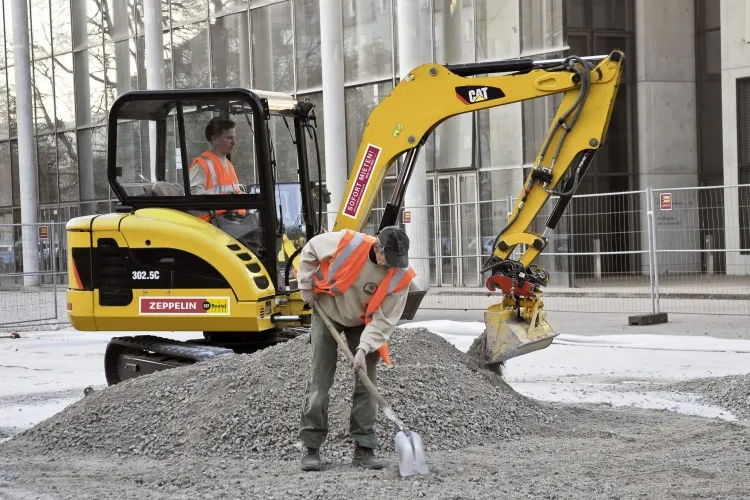 Und so rollten Ende des vergangenen Jahres unter anderem ein Minibagger 302.5 C, die Radlader CAT 906 H und Kramer 280, ein Teleskopstapler Merlo 38.16 ROTO sowie über 200 Meter Bauzaun inklusive Torflügeln aus dem Mietpark von Zeppelin Rental an. Die beauftragte Paradiesfabrik GmbH, ein Garten- und Landschaftsbauunternehmen mit Sitz in Berlin, musste zunächst auf einer Fläche von über 600 Quadratmetern das Fundament für das Provisorium schaffen, auf das anschließend die Bodenplatten gegossen wurden.