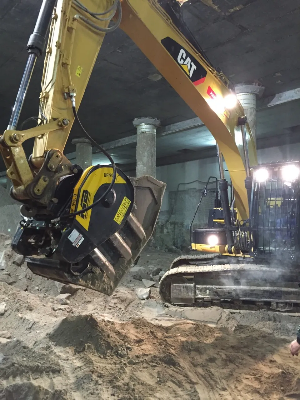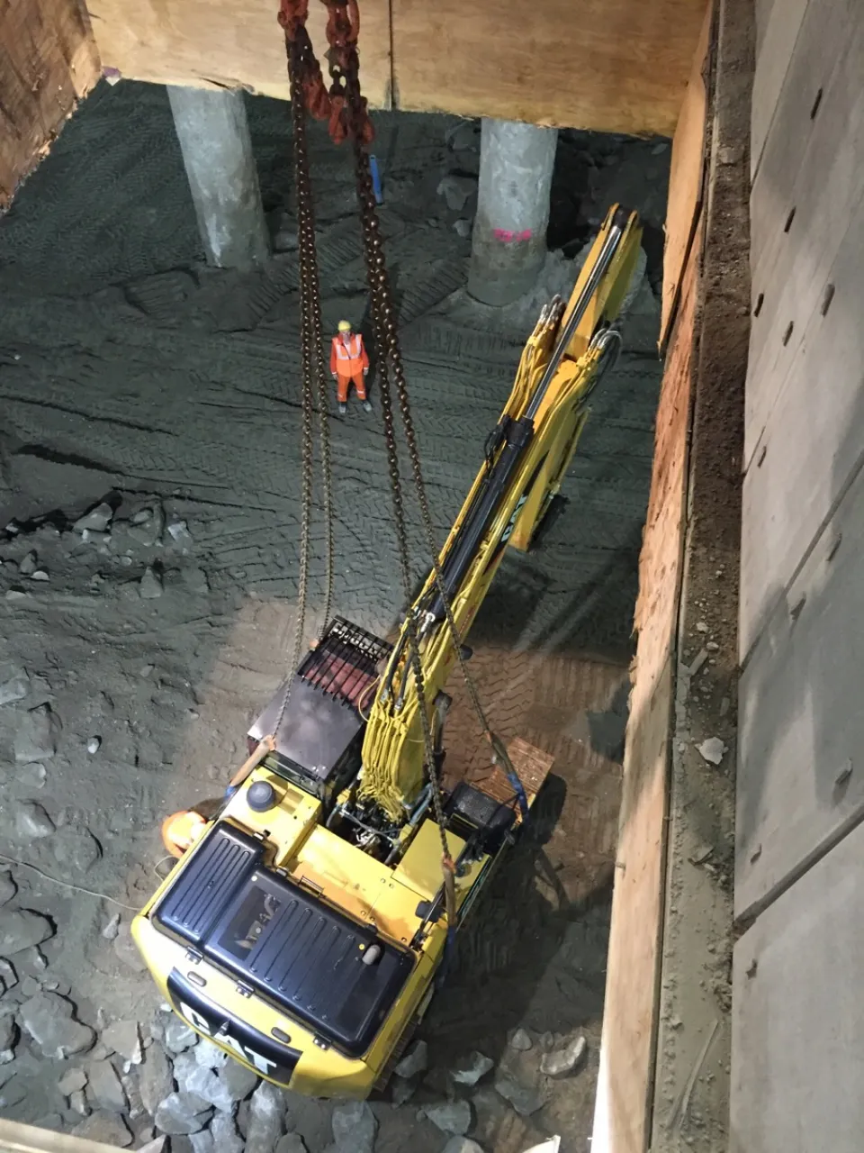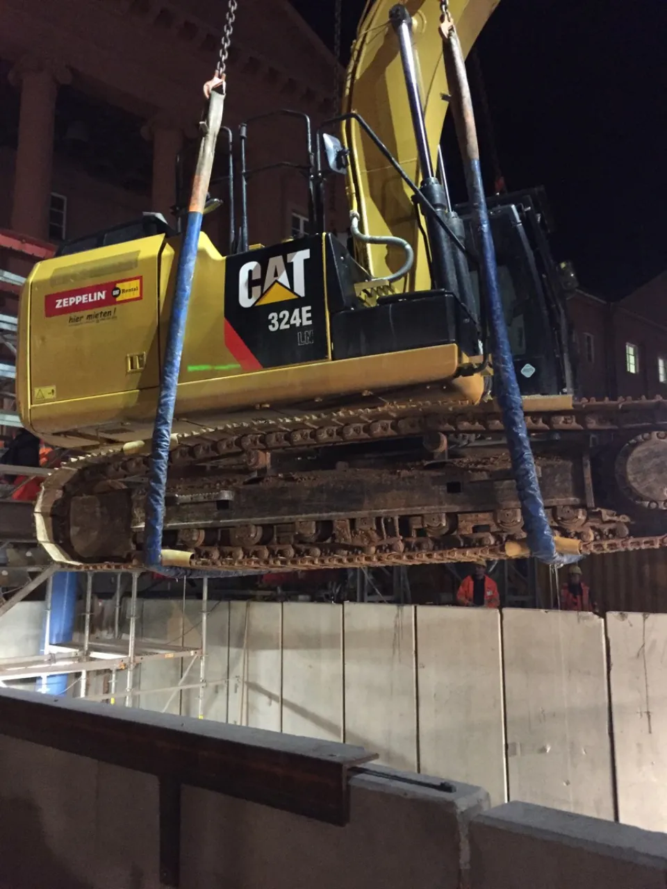 Die Baumaschine musste per Autokran durch die sogenannte Andienöffnung vor dem Rathaus in die Haltestelle „Marktplatz“ eingehoben werden. Dort kam sie bei Aushubarbeiten zum Einsatz. Außerdem wurden mit dem Bagger Rückstände der im Hochdruckinjektionsverfahren hergestellten Haltestellensohle vor Ort zerkleinert. Der Materialtransport an die Oberfläche mittels Kettenbagger CAT 329E LN mit Greifer samt -verlängerung – ebenfalls aus dem Mietpark von Zeppelin Rental – wurde dadurch wesentlich erleichtert und so die Aushubleistung gesteigert.