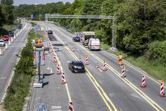 Mitte Mai richtete Zeppelin Rental die Wechselverkehrsführung für die erste Bauphase ein. Sie besteht zum einen aus der Verkehrstechnik, zum anderen aus den Telematikkomponenten. So mussten unter anderem rund 17.000 Meter Fahrbahnmarkierung aufgebracht sowie Baken, Schrankenschutzgitter, Verkehrszeichen und Schutzwände montiert werden. Dazu kamen zwei Schrankenanlagen, zwei Lichtsignalanlagen als Nothaltanlage, LED-Tafeln sowie zwei Fahrbahnbrücken mit Fahrstreifensignalisierung. Im Moment erfolgt der Phasenwechsel des dritten Fahrstreifens noch teils manuell.