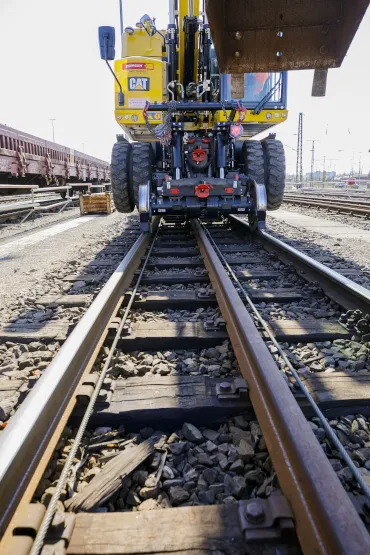 „Wir müssen bei der Gleissanierung auch in den Altbestand des Gleisbetts und der Böschung gehen. Der Bagger befördert das Aushubmaterial per Grabenräumlöffel auf Bahnwagen, danach wird seitlich neuer Schotter zugeführt und egalisiert, also geglättet“, erklärt Bauleiter Becker-Gabriel. Hier konnte die Baumaschine mit einer maximalen Ausleger-Reichweite von 10 Metern und hohem Hubvermögen punkten. Darüber hinaus unterstützte der Zweiwegebagger durch seine Zugkraft von 45 Kilonewton beim Schleppen von Waggons. Danach werden bereits vormontierte Gleisrahmen eingesetzt.