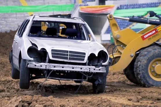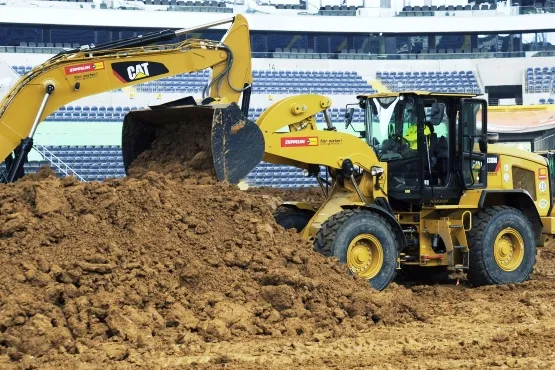 Zum Einsatz kamen mit dem CAT 324, CAT 329 und CAT 336 unter anderem drei Kettenbagger der 20 bis 30-Tonnen Klasse, drei Radlader in verschiedenen Größenklassen, zwei Dozer CAT D6K und ein Walzenzug CAT CS64 B. Während die Monster Truck-Show „Monster Jam“ an verschiedenen Veranstaltungsorten rund um den Globus stattfindet, bleibt das Trackbau-Team aus amerikanischen Maschinisten immer das Gleiche. Die Routine des eingespielten Teams ist nötig, um die Sicherheit der Fahrer und Fahrerinnen bei ihren riskanten Stunts zu gewährleisten. Denn jeder Winkel der Sprungschanzen und jeder Abstand muss stimmen. Für die Baumaschinenführer bedeutet das vor allem eins – viel Reisezeit. Gut, dass sie sich wenigstens auf den Maschinen des US-Herstellers Caterpillar aus unserem Mietpark heimisch fühlten!