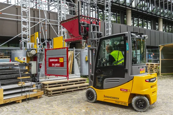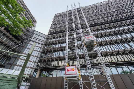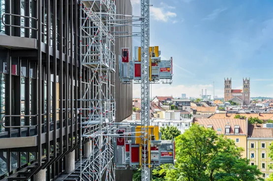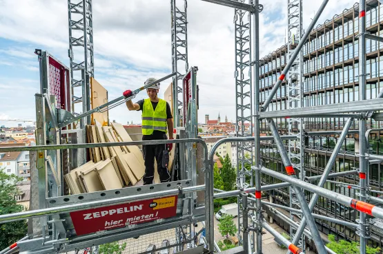 Nachdem das Material angeliefert wurde, folgte zunächst die Nivellierung der Grundgeräte. Anschließend wurden die Aufzüge mit dem Gerüst gleichzeitig nach oben gebaut. So konnten die Gerüstbauer ihr Material direkt mit den Aufzügen befördern. „Für uns war ausschlaggebend, dass wir das Komplettpaket von Zeppelin Rental bekommen“, so Mario Frammelsberger, Projektleiter bei Lindner SE. „Inklusive Baustelleneinrichtung, Aufzug, Gerüst, E-Stapler – und das bei einem zentralen Ansprechpartner und nicht fünf verschiedenen“, erklärt der Projektleiter. Und die Zusammenarbeit wird auch in Zukunft weiter gehen. Ist der erste Projektabschnitt beendet, wird Zeppelin Rental im Februar 2022 zwei weitere baugleiche Aufzüge plus Gerüst montieren. Für einige Wochen werden dann ganze vier Aufzüge die Modernisierung der Büroräume entscheidend vorantreiben. „Die Zusammenarbeit mit Lindner macht mir persönlich besonders viel Spaß, weil sie immer spezielle Aufträge und damit Herausforderungen für uns haben“, freut sich Aufzugsexperte Hurle.