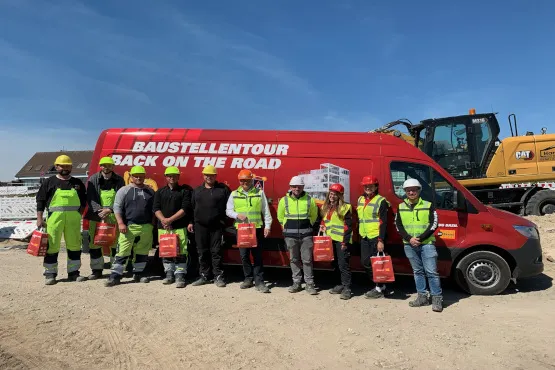 Von Mai bis August - den gesamten Sommer hindurch ist unser leuchtend roter Tourbus auf Baustellen in Deutschland unterwegs. Die erste Station war das Gebiet Nord mit Baustellen in Hamburg, Rendsburg und Lübeck, als nächstes macht der Tourbus Halt in Nordrhein-Westfalen. Wir freuen uns auf den persönlichen Kontakt mit unseren Kundinnen und Kunden!