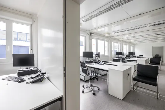 Nach den ersten Gesprächen erstellte Zeppelin Rental unverzüglich die Planungszeichnungen und begann mit der Vorbereitung der Container. So mussten entsprechend ihres Nutzungszwecks beispielsweise Wände entfernt werden, um große Räume wie die Cafeteria zu schaffen, und Glasfronten eingesetzt werden. Aufgrund der großen Stückzahl an Raumsystemen und des hohen Zeitdrucks wurden die vorbereitenden Arbeiten auf alle für den Service verantwortlichen deutschen Raumsystem-Standorte von Zeppelin Rental aufgeteilt. „Zu Projektbeginn haben wir uns einmal täglich via Webkonferenz über den Fortschritt ausgetauscht und die neuesten Informationen weitergegeben“, so Birgit Wojtkowiak. Und auch die Anlieferung der Container musste genau disponiert werden. „Die Koordination und terminliche Steuerung hat unsere Logistik-Abteilung übernommen“, erklärt Christina Poltz.
