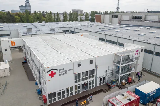 Auch für die Logistik und das Klinikpersonal musste eine funktionierende temporäre Infrastruktur geschaffen werden. Denn im Krankenhausbetrieb ist die Messehalle ein Infektionsbereich und darf nur mit Schutzkleidung betreten werden. Die Mitarbeitenden benötigen jedoch unter anderem Umkleide-, Büro- und Pausenräume. Die Entscheidung fiel deshalb auf die Errichtung eines dreistöckigen Modulbaus vor der Halle 26 mit direkten Zugängen zu den Behandlungsbereichen. Den Auftrag erhielt die Projektabteilung Raumsysteme von Zeppelin Rental in Berlin. Das erfahrene Team vor Ort kennt das Messegelände sehr genau. So hat es in der Vergangenheit bereits zahlreiche Projekte für die Messegesellschaft sowie für Aussteller unterschiedlicher Großveranstaltungen realisiert. Der Bau des Corona-Behandlungszentrums stellte alle Beteiligten aber noch einmal vor besondere Herausforderungen.