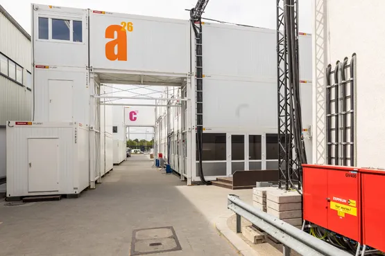 Sowohl die dreistöckige Containeranlage als auch die Raumsysteme in der Messehalle 26 wurden nur sechseinhalb Wochen nach dem Initialgespräch mit den Architekten mängelfrei übergeben.