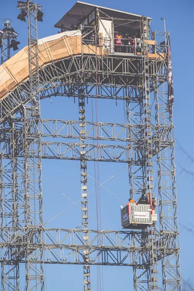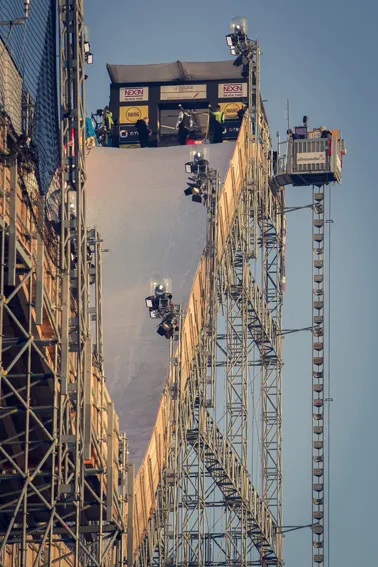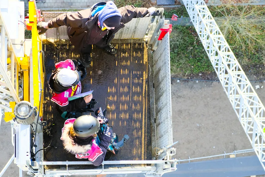 NÜSSLI plante und montierte die Big-Air-Rampe, auf der die Skistars ihre spektakulären Sprünge zeigten, aus über 400 Tonnen Stahl, Holz und Beton. Dabei waren einige Vorgaben zu erfüllen: Die Rampe sollte 120 Meter lang und 49 Meter hoch sein und außerdem die Last von rund 1.000 m3 Schnee tragen können. Zusätzlich musste eine Möglichkeit geschaffen werden, die Athleten zum Starthaus in die Höhe zu befördern. An dieser Stelle kamen die Aufzugsspezialisten von Zeppelin Rental, Edith Simon-Vetter (Leiterin Personenarbeitsbühnen, Aufzüge und Gabelstapler im Gebiet Nordrhein-Westfalen) und Lutz Klütsch (Vertriebsrepräsentant), ins Spiel.