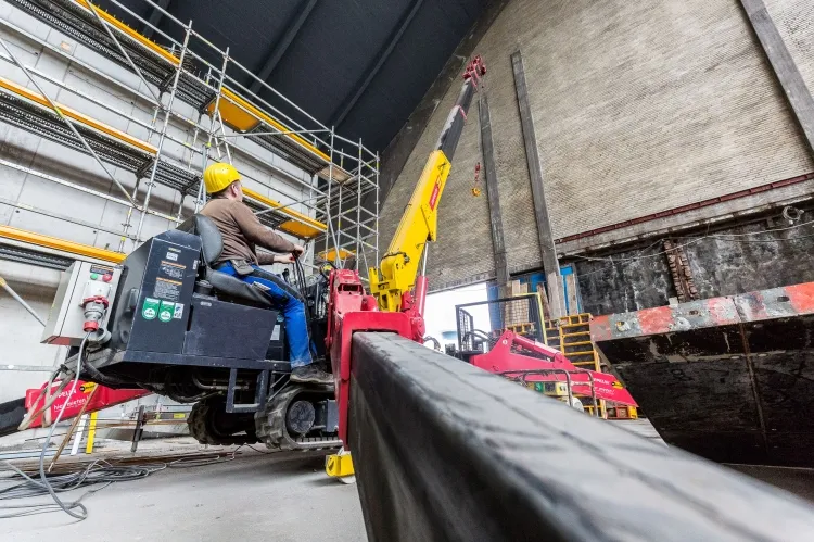 Das Herzstück der neuen Bühne wird ihre Rückwand sein. Sie steht frei, muss aber das 60 Tonnen schwere Bühnendach tragen. Förder- und Höhenzugangstechnik von Zeppelin Rental unterstützt mehrere Gewerke bei verschiedensten Aufgaben. Das Mietstationsteam in Hamburg-Harburg lieferte Minikrane, Scherenbühnen, Gelenkteleskopbühnen mit innovativer Hybridtechnik, eine Raupenbühne, Anhängerbühnen und zwei Gabelstapler.