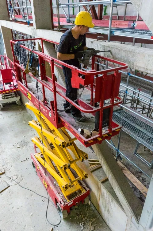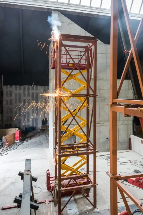 Während die Stapler für jegliche Transportarbeiten eingesetzt werden, dient die Höhenzugangstechnik vor allem Montagen. So müssen beispielsweise zwei vorgefertigte Stahlbögen mit einem Gewicht von je 40 Tonnen mittels einer Hilfskonstruktion eingezogen werden. Die Arbeiter vor Ort führen ebenfalls zahlreiche Tätigkeiten in der Höhe aus. Dazu gehören Maler- und verschiedenste Schweißarbeiten, die Montage und Installation der technischen Decke, das Anbringen von etwa 30.000 Quadratmetern Gipskartonplatten und vieles mehr. Hier helfen Arbeitsbühnen von Zeppelin Rental.