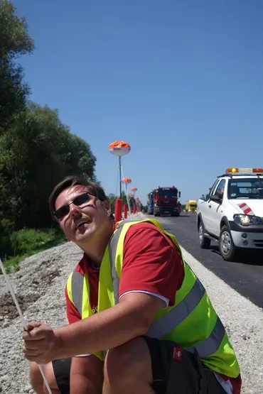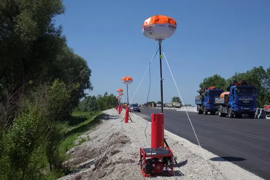 Die Powermoons wurden jedoch nicht nur am Rand der Autobahn aufgebaut. Auf Wunsch des Kunden konzipierte Zeppelin Rental eine Halterung, um die Leuchtballone direkt auf zwei Beschickern und einem Fertiger zu montieren, die werkseitig nicht mit solchen Vorrichtungen ausgestattet waren. Insgesamt wurden 98 LED Moons und 19 Stromaggregate montiert sowie 2.250 Meter 230-Volt-Stromkabel verlegt. Neben dem Antransport und der Montage kümmerte sich Zeppelin Rental auch um die Betankung der Stromaggregate.