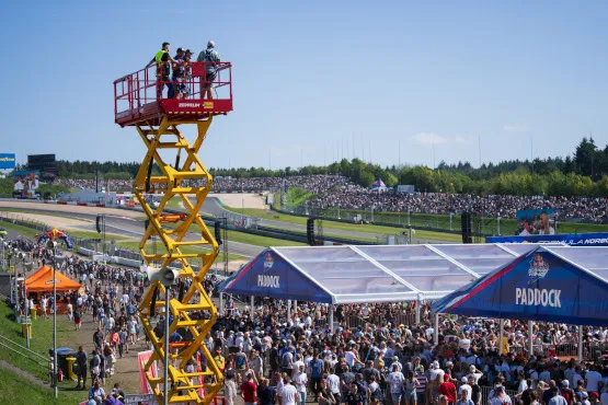 Hoch hinaus mit Zeppelin Rental: Während der Veranstaltung wurde eine Hebebühne für die Zuschauerinnen und Zuschauer bereitgestellt. Sie ermöglichte aus der Vogelperspektive einen exklusiven Blick auf die Müllenbachschleife.