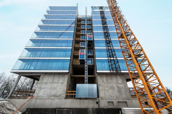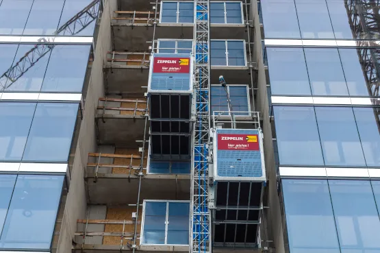 Geradezu futuristisch ragt der neue „KARL-Turm“ über die Dächer des Deggendorfer Zentrums. Doch nicht nur die zehn Stockwerke sorgen für erstaunte Gesichter. So besticht das Gebäude insbesondere durch seine großzügige, doppelte Außenfassade, die komplett aus Glas besteht. Eine spezielle Tatsache, die auch bei der Auswahl der Fördertechnik berücksichtigt werden musste. „Die Glasfassade wurde zügig geschlossen. Deshalb mussten wir Aufzüge installieren, die in eine der vier Nischen reinpassen und trotzdem den individuellen Anforderungen des Kunden gerecht werden“, erklärt Sebastian Hurle, Leiter Aufzüge bei Zeppelin Rental. Bereits seit Januar 2020 greift die KARL-Gruppe deshalb auf den Personen- und Materialaufzug GEDA 1500 Z/ZP zurück, der in der Westnische Material- und Manpower zuverlässig nach oben befördert. Um auch während des anstehenden Innenausbaus einen optimalen Fortschritt der Bauprozesse zu garantieren, setzt die Bauleitung jetzt auf eine weitere Lösung. „Auf Grund der Anzahl der Etagen und der großen Personenanzahl, die täglich befördert werden muss, haben wir den GEDA BL 2000 Twin empfohlen. Dieser legt pro Minute 55 Meter zurück und bietet Platz für 23 Personen – pro Kabine!“, erklärt der Aufzugs-Experte begeistert. Zum Vergleich: Der bereits vorhandene GEDA 1500 Z/ZP transportiert sieben Personen bei einer Geschwindigkeit von 12 Metern pro Minute. Die stattliche Bühnengröße von 1,45 x 3,20 x 2,10 m erlaubt zudem den Transport von sperrigen Gütern bis zu einer Förderhöhe von 250 Metern und einem Gewicht von zwei Tonnen pro Kabine. Mit Hilfe einer Rampe können so unter anderem elektrische Scheren-Arbeitsbühnen in das gewünschte Stockwerk transportiert werden. „Qualität, Robustheit, Flexibilität und nicht zuletzt die Geschwindigkeit des Aufzugs passen perfekt zu unserem Anforderungsprofil. Da wir mit Zeppelin Rental schon eine sehr lange und gute Zusammenarbeit pflegen und uns in puncto Einsatz, Kompetenz und Leistungsvermögen voll und ganz auf sie verlassen können, war für uns nach den ersten Gesprächen relativ schnell klar: Dieses außergewöhnliche Projekt gehen wir mit Zeppelin Rental als Partner an“, betont Silvio Jakob, Leiter Beschaffung und Materialwirtschaft, KARL-Gruppe.