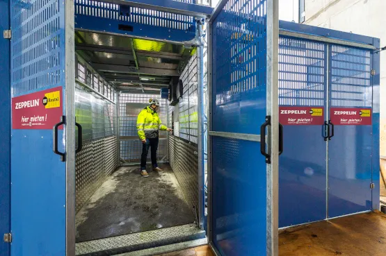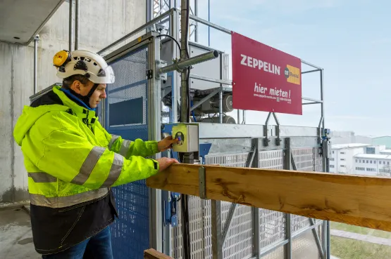Für diese maßgeschneiderte Lösung war nicht nur die Prüfung der Statik essenziell. Insbesondere die enge Zusammenarbeit von Einkauf und Mietstation war gefragt. Denn während Zeppelin Rental Österreich schon zwei Exemplare der Twin-Variante besitzt, ist der Aufzug in Deutschland kein fester Bestandteil der Flotte, da er ein Nischenprodukt ist. „Wir haben ihn extra für dieses Projekt beim Hersteller erworben. Das spiegelt unsere Philosophie wider: Wir haben das Zeug dazu – und wenn nicht, dann besorgen wir es!“, betont Kevin Dendiu, Vertriebsrepräsentant der Mietstation Straubing. Und so wird der GEDA BL 2000 Twin noch bis voraussichtlich Oktober 2021 die Fertigstellung des neuen „KARL-Turm“ tatkräftig unterstützen.