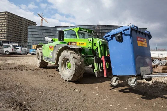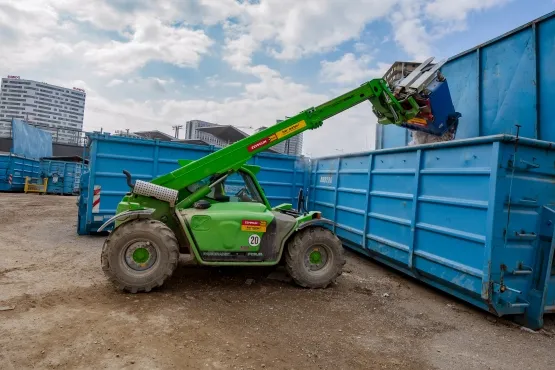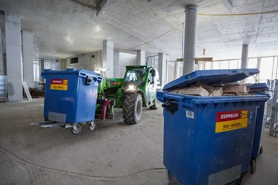 Seit dem Beginn der Ausbauphase im Mai 2017 nimmt die Entsorgungslogistik einen wesentlichen Part der Baulogistikleistungen ein. Denn gerade jetzt wird eine Vielzahl verschiedener Materialien benötigt, von denen bei der Verarbeitung zum einen Verschnitt und zum anderen Verpackungsmaterialien zurückbleiben. Für die ordnungsgemäße Trennung und Entsorgung der Abfälle stellt Zeppelin Rental den Gewerken mittlerweile 150 Sammelbehälter mit einem Fassungsvermögen von je 770 Litern zur Verfügung. Mithilfe von Barcodes auf jedem Baustellenausweis und Behälter können letztere jeweils genau dem Gewerk zugeordnet werden, an das sie übergeben wurden. So bezahlt jedes Gewerk am Ende nur die Entsorgung des Mülls, den es auch tatsächlich verursacht hat.
