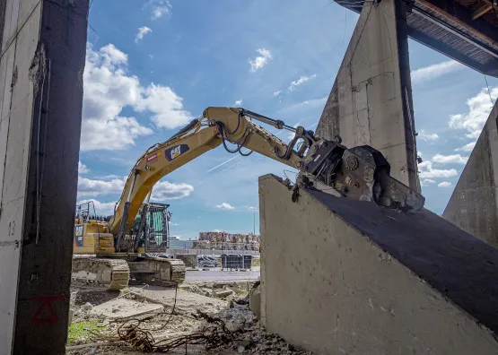 Der ehemalige Prestigebau der Wiener Müllverwertung war längst nicht mehr zeitgemäß, die 68 Meter hohe Holzkonstruktion stellenweise marode. Eine Sanierung wäre zu teuer gewesen, der Bau entsprach nicht mehr den geltenden Brandschutzbedingungen. Deshalb hat sich die Magistratabteilung 48 der Wiener Stadtverwaltung, sprich die Abfallwirtschaft, Straßenreinigung und Fuhrpark dazu durchgerungen, das bei den Wienern als Rinterzelt bekannte Gebäude abzureißen. Eine 43 Meter hohe Teleskop-Bühne und eine weitere 17 Meter hohe Scherenbühne aus dem Mietpark von Zeppelin Rental unterstützten dabei, die mit Asbest kontaminierte Holzdecke und deren Stützpfeiler abzutragen. Der Abbruch: eine logistische Herausforderung. Den Boden unter dem Zeltdach bearbeiteten währenddessen zwei Kettenbagger von Zeppelin Rental, ein CAT 336F und ein CAT 336E mit kompletter Abbruchausrüstung bestehend aus hydraulischen Hämmern, Abbruchscheren und Greifern. "In den 80er Jahren wurde großzügig mit Beton gearbeitet, unsere Maschinen haben jetzt die Aufgabe, das Fundament Stück für Stück aufzubrechen und abzutragen", so Tauscher. Im Anschluss wurde der Stahlbetonrauchfang in der Mitte der Konstruktion abgebrochen.