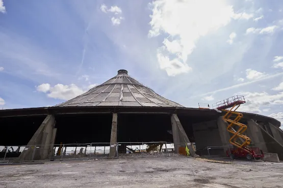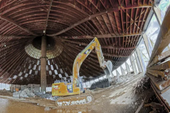 Spektakulärer Höhepunkt der Bauphase war die kontrollierte Sprengung der übrig gebliebenen, mehr als 100 Meter langen Holzleimbinder. Hier kam nochmals die 43 Meter hohe Teleskopbühne zum Einsatz, um das Sprengunternehmen mit der Positionierung der Sprengschnüre an den Holzleimbindern zu unterstützen. Der Rückbau des Prestigeobjektes schlug mit drei Millionen Euro zu Buche. Dabei können laut M48 rund 98 Prozent des Abbruchmaterials recycelt werden.