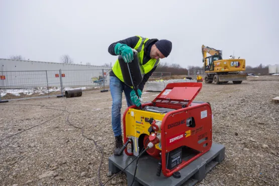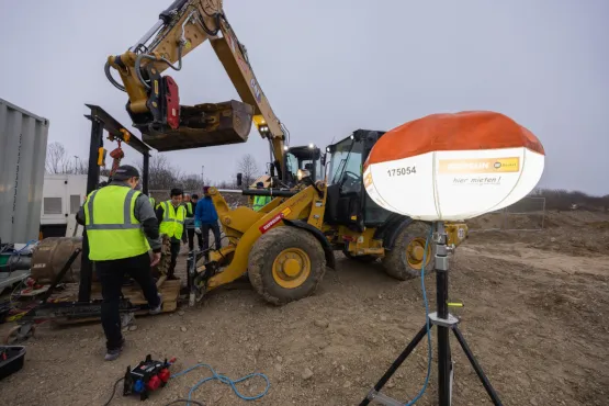 Kein Strom, keine Tests: Die mobilen Stromerzeuger von Zeppelin Rental versorgten die Tunnelbohrmaschine sowie die Akku-Werkzeuge während der Vorbereitungsphase mit ausreichend Energie. Die Flutlichtanlagen hingegen ermöglichten ein Arbeiten bei Dunkelheit. „Wir waren täglich mehrere Stunden an der Bohrmaschine. Oft bis spät in die Nacht hinein“, sagt das Team. „Ohne die Flutlichtanlagen hätten wir nicht so lange arbeiten und damit nicht unseren straffen Zeitplan einhalten können.“ Und auch die modularen Raumsysteme von Zeppelin Rental dienten als Lagerfläche und überdachte Werkstatt.