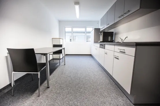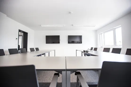 Die verlegten Böden in Besprechungsräumen und Büros bestehen aus hochwertigem Nadel-Vlies. Die Innenwände und -decken wurden zur Erfüllung der erhöhten Brandschutzanforderungen mit Rigipsplatten verkleidet sowie tapeziert und gestrichen. Die Sanitärräume sind mit anspruchsvoller Sanitäreinrichtung und Bodenfliesen ausgestattet. Im Eingangsbereich der Anlage schützt ein Glasvordach vor widrigen Wetterbedingungen. Jedes Bürofenster ist mit einer elektrischen Verschattung ausgestattet, die die Mitarbeiter individuell steuern können.
