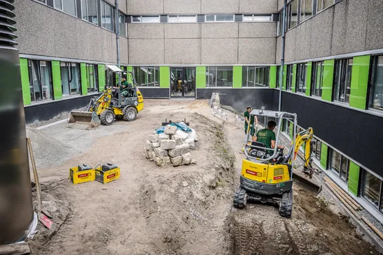 Der Startschuss für die Baumaßnahme fiel im Frühjahr dieses Jahres. In einem 30 mal 12 Meter großen Innenhof, bisher eine Brachfläche, sollten zwei Terrassen, zwei Natursteinmauern und eine Böschung angelegt werden. Was einfach klingt, bot mehrere Herausforderungen. „Zum einen befindet sich der Ansaugturm einer Lüftungsanlage direkt im Hof. Er versorgt die Produktionsbereiche einer Apotheke der Medizinischen Hochschule mit Frischluft. Und diese Räumlichkeiten müssen steril sein“, erklärt Jan Funke. Aus diesem Grund kamen dieselbetriebene Baumaschinen und -geräte nicht in Frage, der Auftraggeber forderte komplett emissionsfreies Arbeiten. Und hier kam Zeppelin Rental ins Spiel.