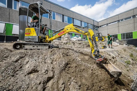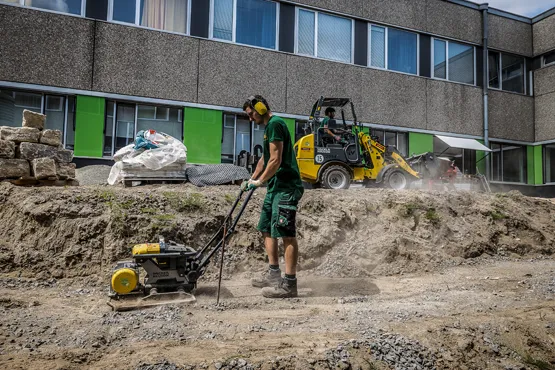 Bei der Neugestaltung des Innenhofs der Medizinischen Hochschule gab es hinsichtlich der Stromversorgung keine Probleme: Der Bauherr ließ eigens eine Steckdose für diesen Zweck installieren. Und auch die Verfügbarkeit emissionsfreier Arbeitsgeräte in der gewünschten Größe war gegeben. Die Mietstation Hannover-Laatzen von Zeppelin Rental unter der Leitung von Mateusz Pionke stellte dem Garten- und Landschaftsbauer einen Minibagger WN EZ17e, einen Radlader WL20e sowie eine Rüttelplatte AP2560e von Hersteller Wacker Neuson zur Verfügung. Alle Produkte hält das Unternehmen in seiner Flotte vor. „Damit sind wir auch bei dieser neuen Technik schnell lieferfähig“, erklärt der stellvertretende Mietstationsleiter Jakub Sobkowski, der den Kunden und das Projekt von Seiten Zeppelin Rental betreute.