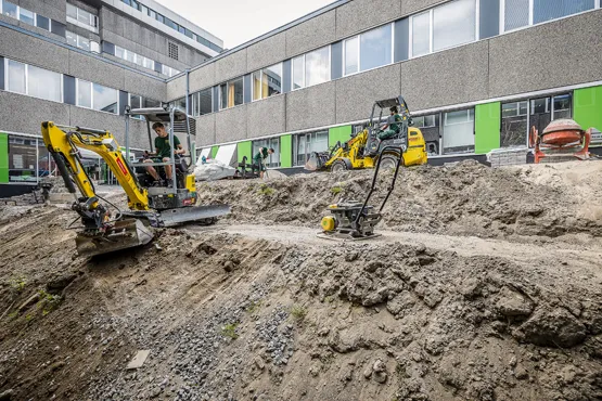 Und auch Bauleiter Jan Funke zeigt sich zufrieden mit seiner E-Premiere. „Zu Beginn war es ungewohnt für uns alle – es war plötzlich so leise“, lacht er. Als positiv empfindet er vor allem die Laufzeiten. Bis zu fünf Stunden konnten Radlader und Minibagger ohne Nachladen arbeiten, kurz vor dem Feierabend ging es an die Steckdose. „Bei keinem der Arbeitsgeräte war jemals der Akku leer“, so Funke. Vom Einsatz der E-Technik profitierten auch Angestellte der Medizinischen Hochschule. Sie arbeiteten direkt angrenzend an den Innenhof und waren keinem Lärm und keinen Abgasen ausgesetzt. Eine weitere Herausforderung des Projekts stellte neben den speziellen Ansprüchen an die eingesetzte Technik auch die Logistik dar. So verfügt der Innenhof über keinen Zugang nach außen. Sämtliche Arbeitsmaterialien und -geräte sowie der anfallende Aushub mussten per Autokran über das Gebäude ein- und wieder ausgehoben werden. Da die Medizinische Hochschule auch von Rettungshubschraubern angeflogen wird, waren enge Abstimmungen und die Genehmigung der Kraneinsätze durch die Luftfahrtbehörde erforderlich. „Für uns hat das einen recht hohen organisatorischen Aufwand bedeutet“, so Funke.
