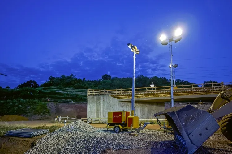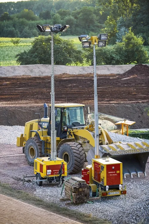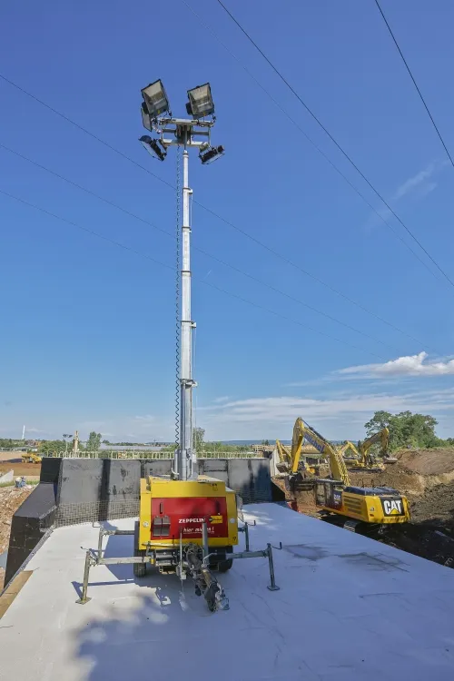 Zur Gewährleistung der Nachtarbeiten mietete die KAF Falkenhahn Bau AG von Zeppelin Rental in Hanau die nötige Beleuchtung samt angebotener Geräteversicherung. Insgesamt knapp 20 Flutlichtanlagen mit Leistungen von sechs bis 16,5 kVA, darunter ein LED-Leuchtmast, sowie vier Powermoon Leuchtballone inklusive Stative stellte die Mietstation zur Verfügung. Die benötigten Starkstromkabel stammten ebenfalls aus dem Mietpark. Um den Kunden zu entlasten, kümmerte sich Zeppelin Rental zusätzlich um den An- und Abtransport aller Geräte.
