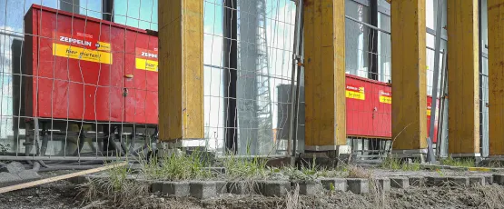 Ebenso gewährleistet Zeppelin Rental die Bauwasserversorgung der Abbrucharbeiten. Eine PE/HD Leitung DN 50, gespeist durch ein Standrohr an einem Unterflurhydranten, überbrückt die gut 200 Meter vom öffentlichen Versorger zur Baustelle. Als Frostschutz wurde ein innenliegendes Heizband als Rohrbegleitheizung eingezogen. Des Weiteren war Vorgabe, die Löschwasserversorgung von sechseinhalb Kubikmeter Wasser pro Stunde sicherzustellen. Hochleistungspumpen sorgen dafür, dass auch in 138 Metern genügend Druck ankommt.