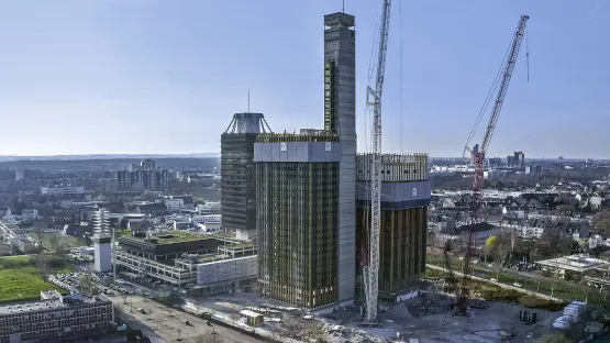 Etwa 85 Prozent des Abbruchmaterials wird recycelt und wieder verfüllt. Mittlerweile steht nur noch das Stahlskelett, zuvor wurden die asbestbelasteten Bauteile unter höchsten Sicherheitsvorkehrungen entfernt. Für die Demontage eines Stockwerks benötigt das Team von Daniel Schön etwa zwei Wochen. Mit dem Abbruchfortschritt wandern auch die Stromverteiler Etage für Etage nach unten. Stück für Stück werden die Türme kleiner, bis zum Sommer 2021 wollen Daniel Schön und sein Team fertig sein. Dann beginnen auf dem 56.000 Quadratmeter großen Areal die Bauarbeiten für die 750 geplanten Wohn- und Gewerbeeinheiten.