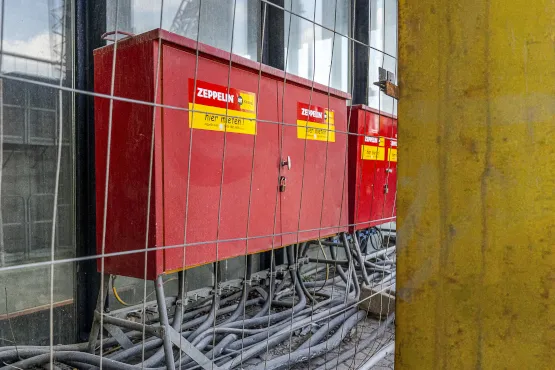 Das 1,6 Meter hohe Kettenblatt einer Diamantsäge frisst sich langsam und gleichmäßig durch den Beton, an anderer Stelle sprühen die Funken beim Schneiden von Stahl. Dann ist die letzte Verbindungsnaht gekappt, die schweren Ketten heben das Deckenelement an, es schwebt am Raupenkran weit über Köln am rund 180 Meter langen Ausleger. „Jetzt ist das Gebäude wieder um 13 Tonnen leichter“, so Daniel Schön, Oberpolier von BST Becker. „Allein die Diamantsäge benötigt eine Absicherung von 63 Ampere, davon sind vier im Einsatz, plus diverse Abbruchroboter, Brenner und Werkzeuge. So kommen auf einer Etage locker 170 kVA zusammen“, rechnet er vor. „Hier fließt enorm viel Energie.“ Und die stellt Zeppelin Rental sicher. Am Rande des Baufelds sorgten zeitweise zwei begehbare Transformatorenstationen, eine mit 630 kVA und eine mit 400 kVA Leistung dafür, dass selbst im obersten Stockwerk noch genügend Spannung herrscht. 38 Haupt-, Gruppen- und Endverteiler stellen auf über 32 Etagen die Stromversorgung für den Abbruch des Büro-, Studio- und Aufzugsturms sicher.