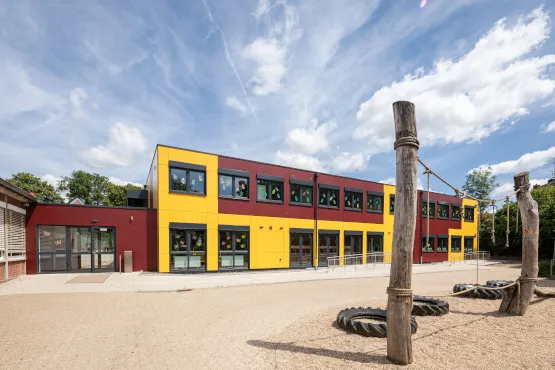 Auch die individuelle Gestaltung des Außenbereiches wurde zwischen Mai und August 2022 realisiert. Eingangspodeste wurden installiert, ein Warmdach mit Gefälledämmung angebracht sowie eine Sonnenschutzanlage montiert. Hierbei setzte Zeppelin Rental auf stabile Raffstores, welche die Sonne zwar abstrahlen, gleichzeitig jedoch genug Tageslicht durchlassen. Um Barrierefreiheit zu garantieren, wurde zudem ein Plattformlift realisiert. „Aufgrund des Schulstarts war es essenziell, dass es zu einer termingerechten Fertigstellung des Gebäudes kommt. Wir haben Zeppelin Rental als sehr zuverlässiges und engagiertes Unternehmen kennengelernt“, sagt Anna Trundelberg.