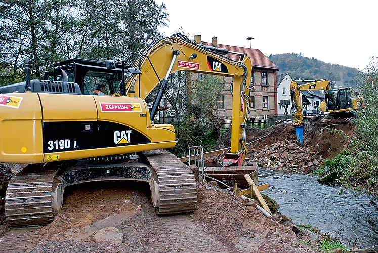 Inzwischen rollt die Kahlgrundbahn wieder zuverlässig über die Schienen. Die Schäfer-Bauten GmbH hatte aber auch nach der Sperrpause noch einige Arbeiten zu erledigen. Für die Ufergestaltung um die beiden 14,5 Meter langen Brücken herum mietete das Bauunternehmen bei Zeppelin Rental beispielsweise für einige Wochen den Kettenbagger CAT 308 DCR mit Verstellausleger.
