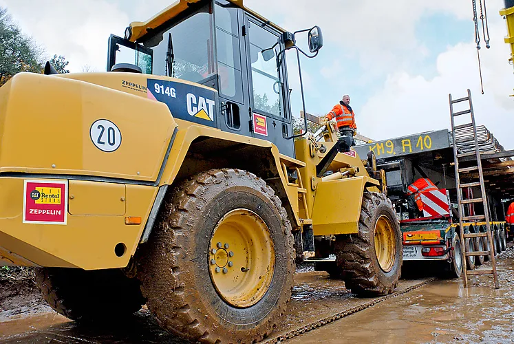 Nach der Baustelleneinrichtung folgten nacheinander die Abbrüche beider Überführungen mit dem Mobilbagger mit Hydraulikhammer sowie dem 20-Tonnen-Kettenbagger mit Grabenräumlöffel aus dem Mietpark von Zeppelin Rental, anschließend der Neubau. Der Radlader CAT 914 G führte hier Transportarbeiten aus und verfuhr beispielsweise Beton, der unter anderem für die Verbindung der Unterbauten benötigt wurde. Nach dem Aufsetzen des Gleisüberbaus sowie der Kappen mussten Hohlräume zwischen Bahndamm und Brücken erst verfüllt und anschließend mit Rüttelplatten und dem Stampfer von Zeppelin Rental verdichtet werden.