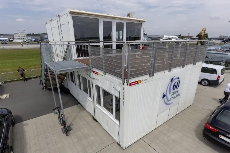 Für die Messe stellte ein Team der Projektabteilung Raumsysteme in Berlin um Projektleiterin Birgit Wojtkowiak in diesem Jahr insgesamt 210 Container zur Verfügung – darunter das Herz der Ausstellung, einen viergeschossigen Containerturm. Der sogenannte ILA-Tower diente der Flugleitung als Büro und Aufenthaltsraum sowie der Koordination und Überwachung von Flugvorführungen während der Messe. Aus diesem Grund wurden Raumsysteme mit vollverglasten Fronten verbaut, die eine perfekte Sicht auf das Geschehen am Himmel und auf der Erde ermöglichten. Dank zahlreicher Terrassen und Balkone lieferte der Turm auch einen optimalen Ausblick auf das Gelände, den unter anderem Journalisten für Foto- und Filmaufnahmen nutzten.