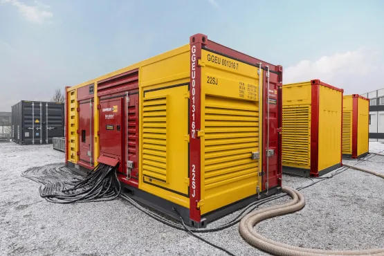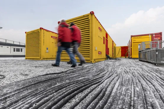 Insgesamt umfasst die Anlage drei Stromgeneratoren zwischen 1450 und 2000 kVA Leistung. Diese speisen wiederum drei Transformatoren, welche die Energie von Niederspannung in Mittelspannung umwandeln und an einen speziellen Mittelspannungsschaltcontainer weiterleiten. Von dort wird der Strom – falls nötig – auf den Betrieb aufgeteilt. Zudem befinden sich zwei Tank-Container mit 20.000 Liter Fassungsvermögen vor Ort: „Nach Rücksprache mit dem Kunden haben wir empfohlen, die Tanks mit Diesel anstatt Heizöl zu befüllen. Aufgrund der aktuell niedrigen Temperaturen müsste Öl kontinuierlich beheizt werden“, führt der Projektleiter weiter aus.