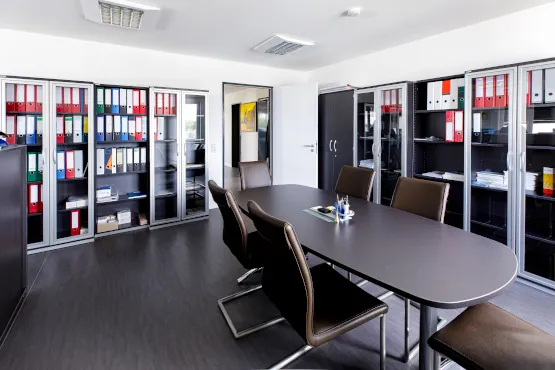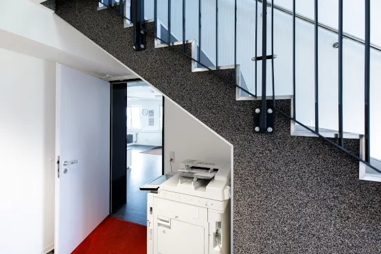 Für das neue Bürogebäude wurden für die Sanitärbereiche Fliesen gewählt. In den restlichen Räumen wurden pflegeleichter und robuster PVC-Bodenbelag oder Nadelfilz verlegt. Um die Barrierefreiheit im Gebäude zu garantieren, wurden die Schwellen und Übergänge entsprechend gestaltet.