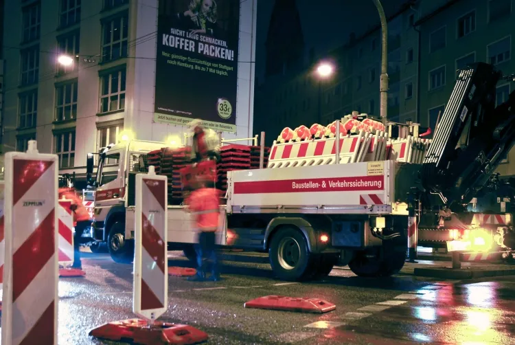 Die Wasserleitungen werden entlang von Gehwegen und Gebäuden, aber auch über zahlreiche Straßen geführt. Die Querungen gehen nachts vonstatten, da sie umfangreiche Absperr- und Verkehrssicherungsmaßnahmen erfordern. Vorgenommen werden diese vom Kompetenz-Center Baustellen- und Verkehrssicherung von Zeppelin Rental in Waiblingen unter der Leitung von Stephan Diehl. Nur eine Querung von vielen: die der Willy-Brandt-Straße am Neckartor. Um den Antransport der für die Rohrverlegung in 5,50 Metern Höhe benötigten Traverse sowie deren Montage sicherstellen zu können, mussten die Straße gesperrt sowie Umleitungsstrecken eingerichtet werden.