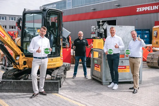Gemeinsam mit Martin Sebestyén, Bereichsleiter Flottenmanagement und Pricing, Dr. Markus Heidak, CSR-Manager, und Markus Blenk nahm Bernd Kreiselmeier einen der ersten HVO-Tanks bei Zeppelin Rental in Empfang.