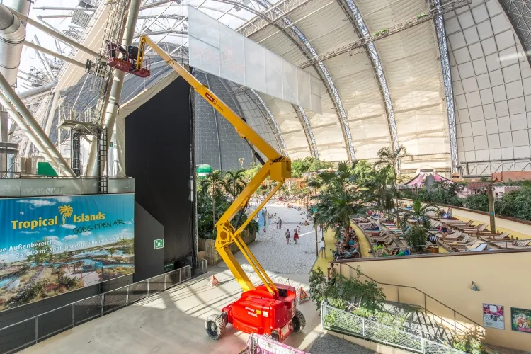 Genau diese Eigenschaften der Bühne sind es, die dem Tropical Islands entgegen kommen. Benötigt wird die Miettechnik beispielsweise für die Wartung und Reparatur der Leuchtmittel auf den Parkplätzen, für Baumschnittarbeiten und zur Reinigung von Fenstern und Fassaden innen und außen oder die Revitalisierung der Halle. Die Aufgaben sind vielfältig und werden von verschiedenen Abteilungen wie Haustechnik, Cleaning, Building Management oder Projekt Development durchgeführt.