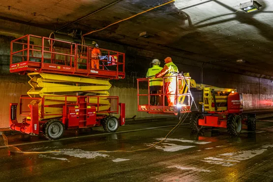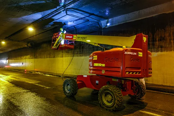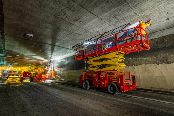 Für die Sanierung des Tunnels Rannersdorf stellten Martin Mizerovsky, Leiter Miete Österreich, und die Mietstationen Brunn am Gebirge und Fischamend in kürzester Zeit mehrere Personenarbeitsbühnen, drei Stromerzeuger, einen Kompressor, einen Radlader CAT 906 sowie einen Toyota Hilux zur Miete zur Verfügung. Während der Toyota als Dispofahrzeug dem Transport von Personal und Material diente, wurden von den Teleskop-, Gelenk-Teleskop- und Scherenbühnen aus Sanierungs- und Schalungsarbeiten an den Tunnelwänden und -decken durchgeführt.