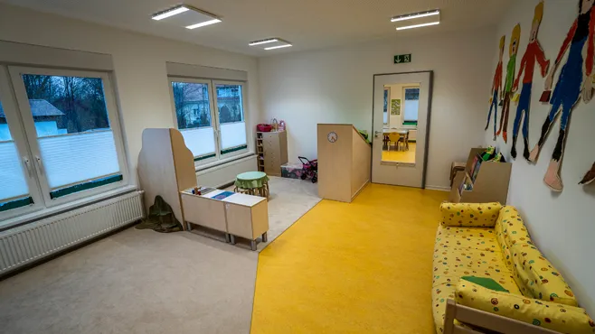Die temporäre Kita erfüllt alle Anforderungen hinsichtlich der aktuell gültigen Energieeinsparverordnung und hat eine voraussichtliche Standzeit von fünf Jahren. Bis zu 25 Kinder im Alter von drei Jahren bis zum Schuleintritt werden darin betreut.