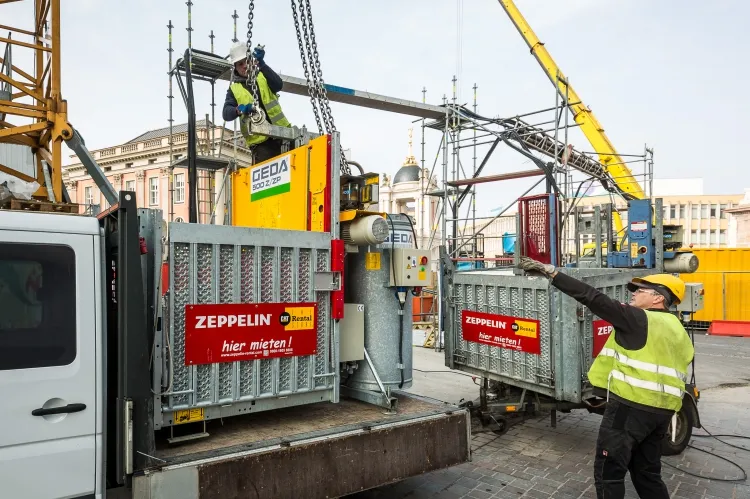 Die Montage erfolgte über das Uni-Mastsystem: 1,5 Meter lange Mastteile mit unverlierbaren Schrauben und gesicherten Muttern wurden von der Transportbühne aus aufeinander gesteckt; der Aufzug konnte auf diese Weise schnell und sicher „in die Höhe klettern“. Zeppelin Rental sorgte so für den Aufbau, befestigte den Mast am Gerüst und baute zusätzlich je neun Etagensicherungstüren ein. Die mit einer seitlichen Be- und einer Entladeklappe ausgestatten Aufzüge am künftigen Museum Barberini reichen rund 20 Meter in die Höhe. Bei Bedarf wäre eine Auf- oder Abstockung der Förderhöhe jedoch jederzeit problemlos möglich, auch eine Umsetzung realisiert Zeppelin Rental auf Wunsch gerne. Zum Leistungsspektrum gehört selbstverständlich auch die professionelle Einweisung in die Bedienung der Aufzüge, die nun allen beteiligten Gewerken beim Hoch- und Ausbau zur Verfügung steht.